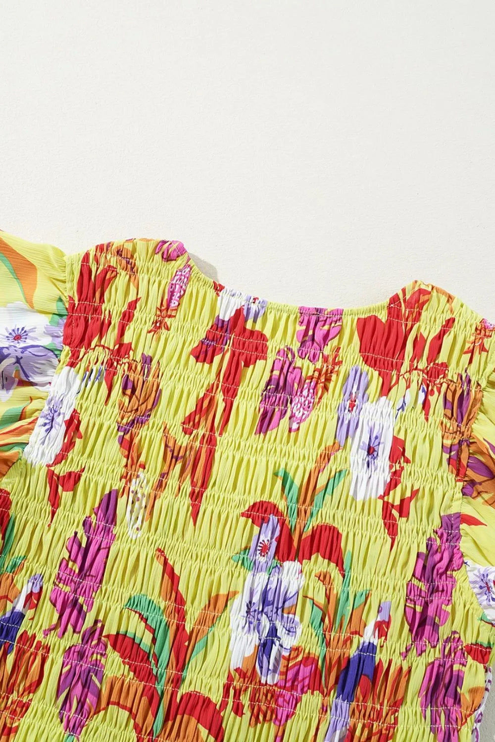 Cheetah Plant Print Shirred Button V Neck Maxi Dress