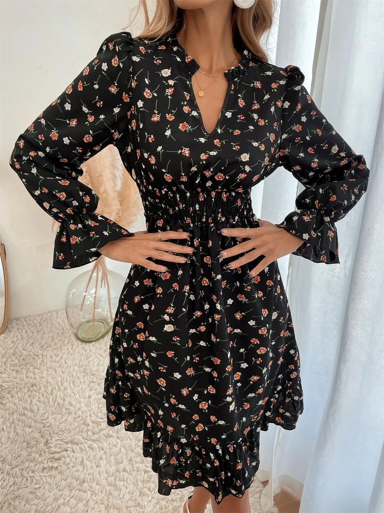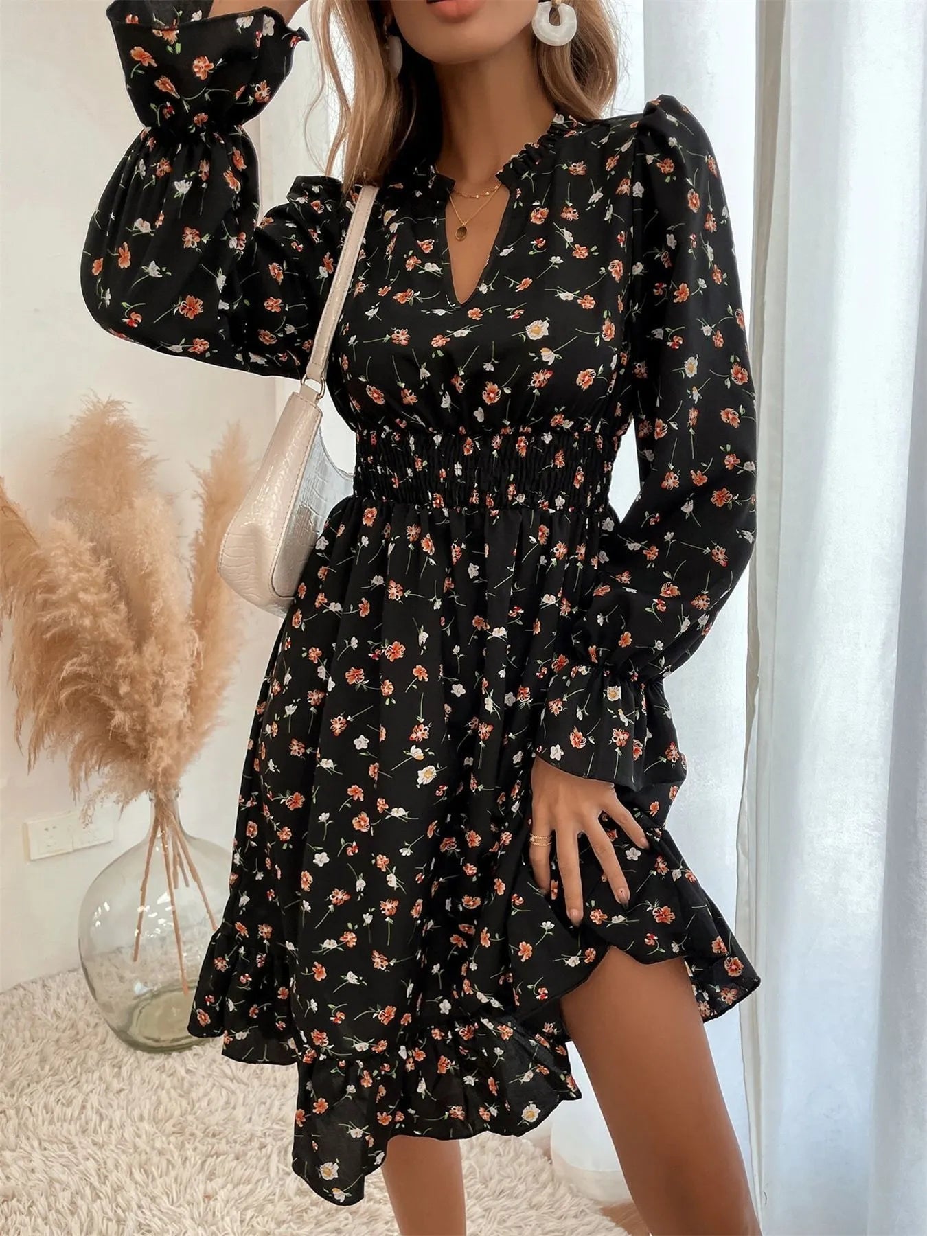 Floral Print Long Sleeve Notched Dress