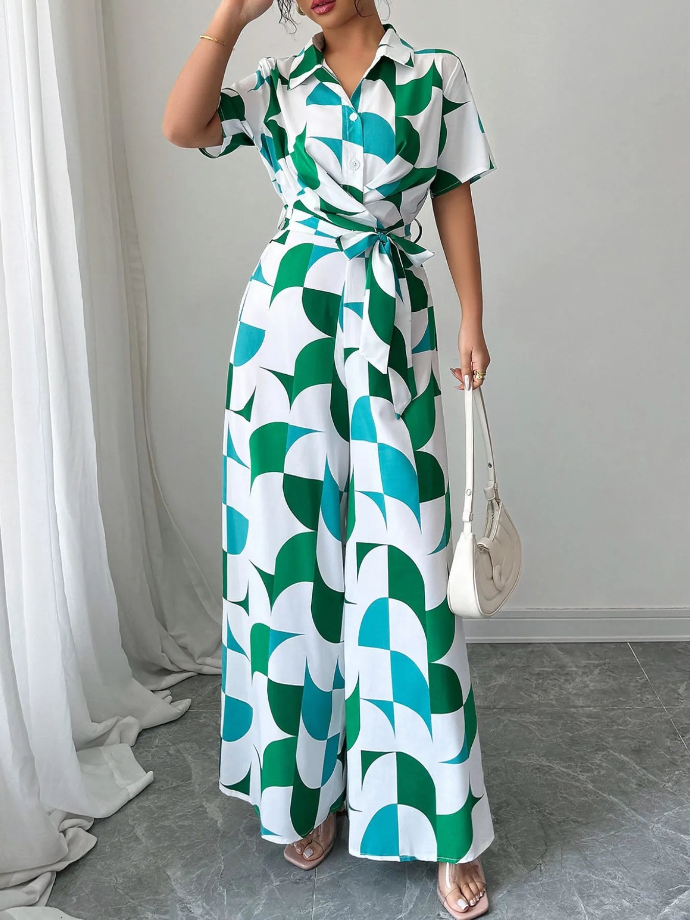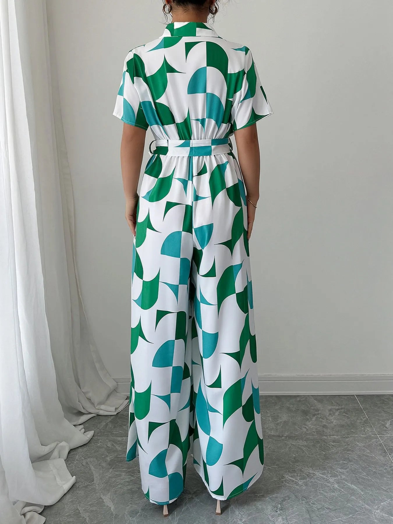 Geometric Print Belted Wide Leg Jumpsuit