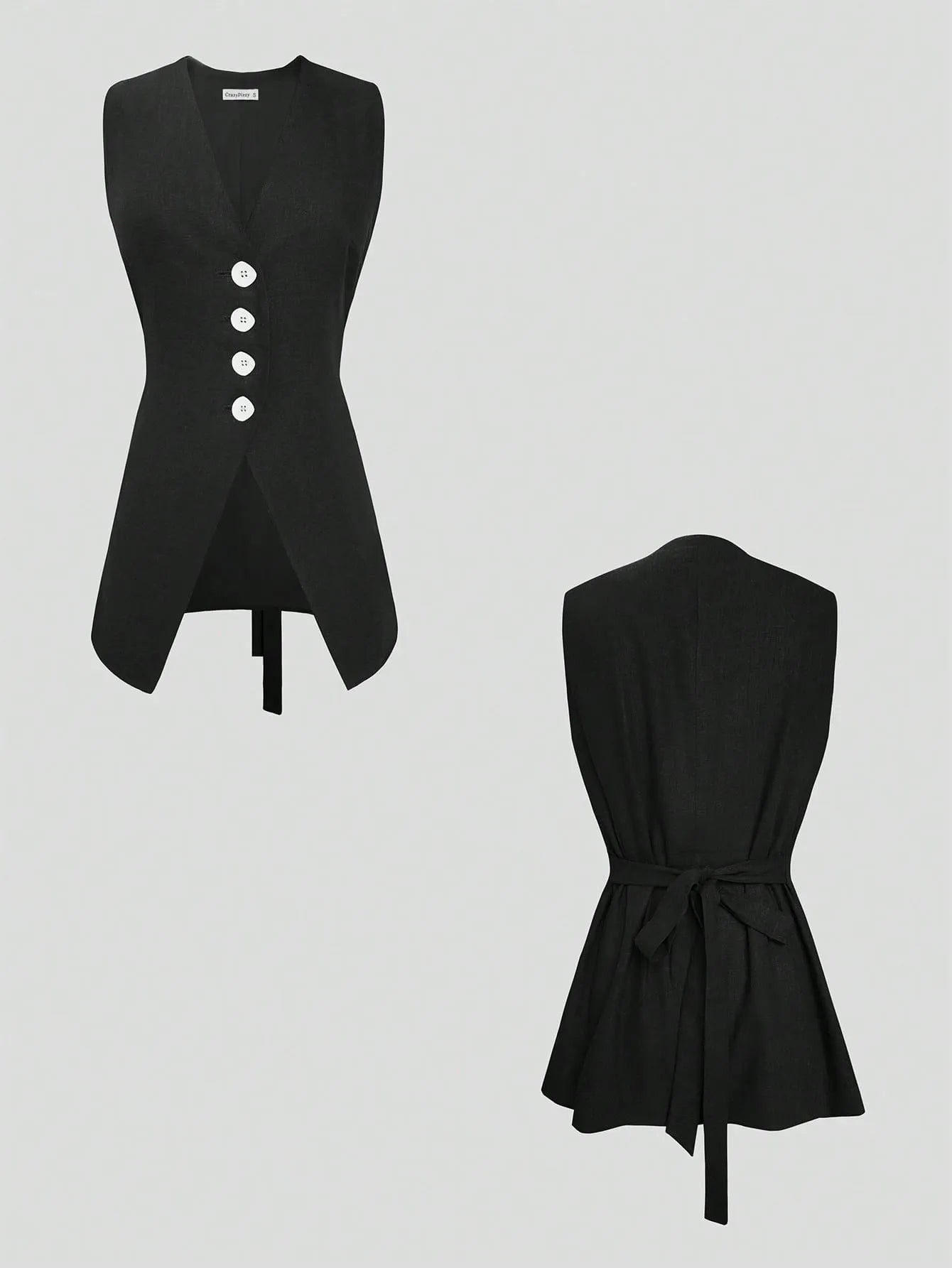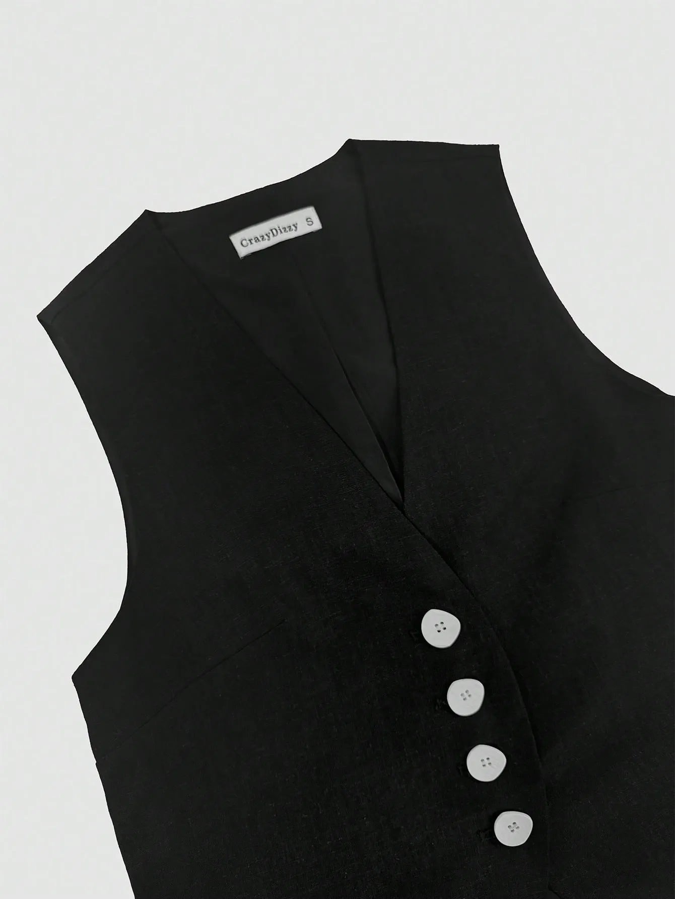 V-Neck Button Detail Vest and Skirt Two-Piece Set