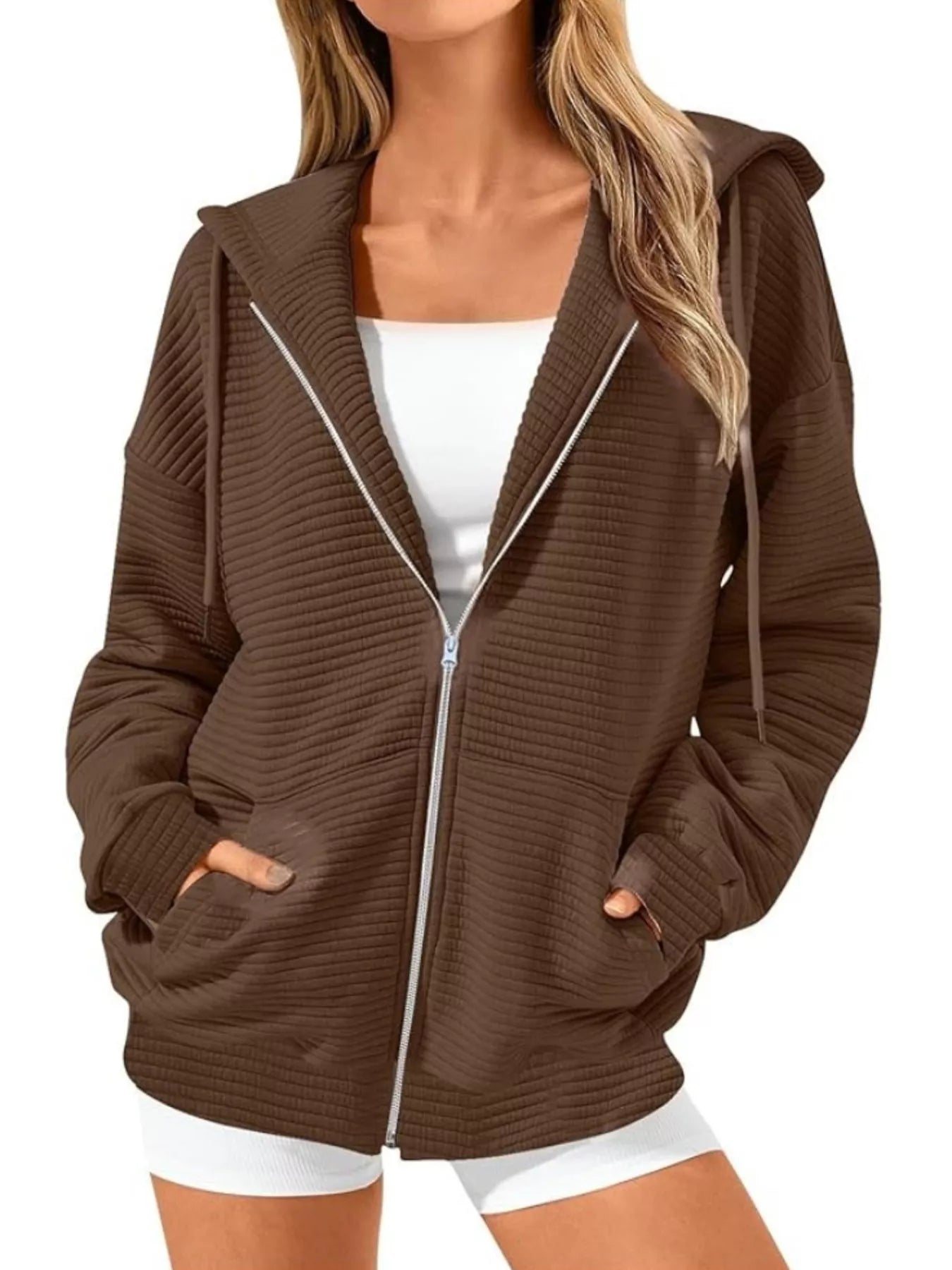 Drawstring Zip Up Dropped Shoulder Hoodie