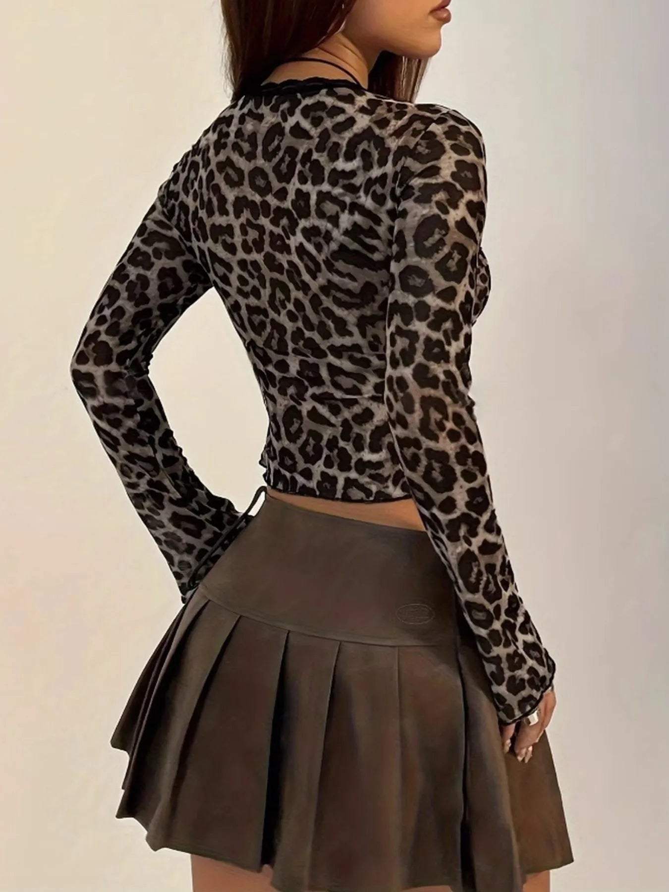 Leopard Print Long Sleeve Tie-Front Top