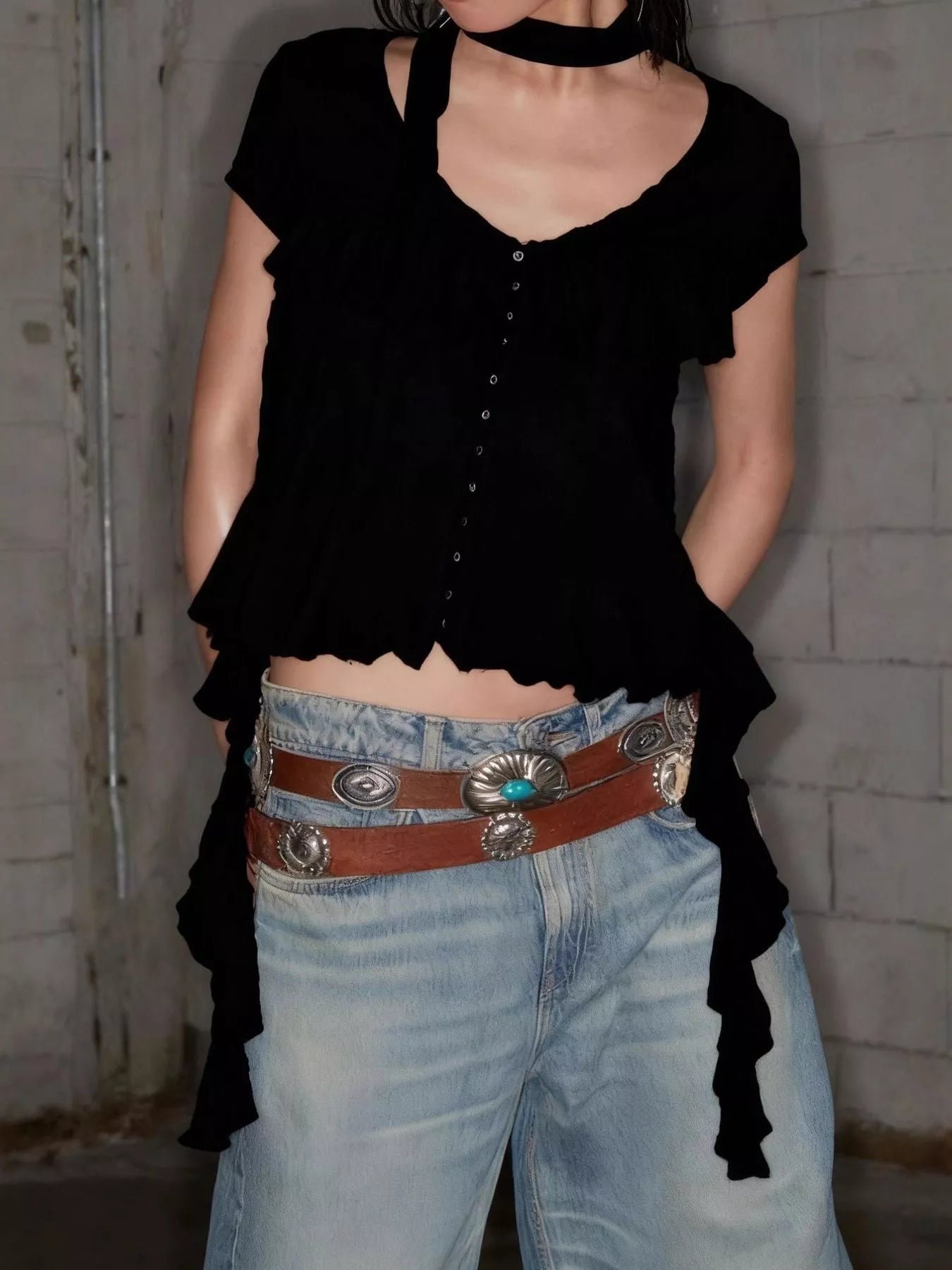• Features:Lace,Buttoned,Ruffled,Sheer
